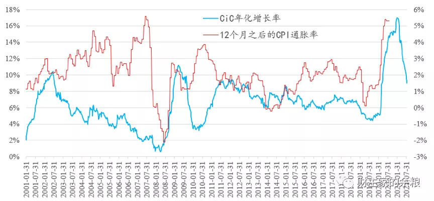 把過去20年里CiC的年化增長率與12個(gè)月后的CPI通脹進(jìn)行對(duì)比,除了能看出來CiC的增長率與通脹相關(guān)性很高之外,也明顯看出美聯(lián)儲(chǔ)的操作思路。