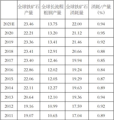 表為2021年全球鐵礦石產(chǎn)量和消費量預(yù)測(單位:億噸)