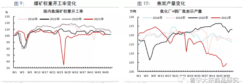 焦炭的需求主要在鐵水端,鐵水量的多少取決于終端需求和限產(chǎn)政策。前期地產(chǎn)政策的過度收緊,既拖累經(jīng)濟下行,也有硬著陸的系統(tǒng)風(fēng)險。12月6日的政治局會議要求促進房地產(chǎn)業(yè)健康發(fā)展和良性循環(huán),地產(chǎn)政策底逐步兌現(xiàn),但從政策底到基本面底,仍需較長時間。目前鐵水產(chǎn)量偏低,采暖季冬季來臨,冬奧會也進入倒計時,即使鋼廠完成限產(chǎn)任務(wù),有復(fù)產(chǎn)預(yù)期,實際鐵水產(chǎn)量也難以大幅回升。這將拖累焦炭真實需求,預(yù)計真實需求的改善將在3月份左右。