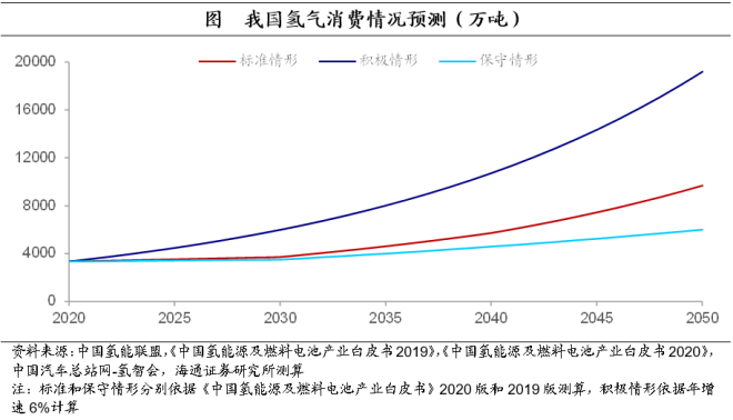 氫能需求的增長,勢必帶來生產(chǎn)端的增長。前文提到,根據(jù)中國煤炭工業(yè)協(xié)會的統(tǒng)計口徑,2012-2020年,我國氫氣產(chǎn)量的年均增速約為5.7%,呈現(xiàn)穩(wěn)步增長趨勢,預計下一階段生產(chǎn)增速將略有提高,以滿足日益增長的國內(nèi)消費和出口需求。根據(jù)中國氫能協(xié)會在2019年《中國氫能源及燃料電池產(chǎn)業(yè)白皮書》中的預測,氫能產(chǎn)業(yè)鏈產(chǎn)值在2050年將達到從2019年的3000億元增加至12萬億元,年均增速12.6%。而在考慮“碳達峰、碳中和”的目標后,預計實際增速還將高于此。