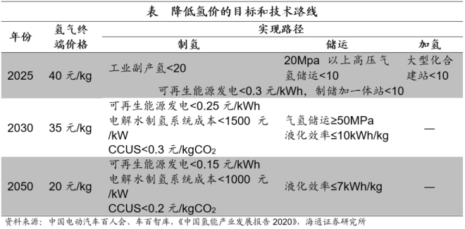 其次,在當前技術條件下,我國氫能終端消費價格高于其他能源,要推廣氫能的使用,就要實現(xiàn)綠氫平價。中國氫能聯(lián)盟專家委員會主任余卓平分析,如果到2025年我國風電、光伏的新增裝機發(fā)電成本降低到0.3元/千瓦時,綠氫成本將降到約25元/千克,能夠與天然氣制氫進行競爭。等2030年可再生能源發(fā)電成本降低到0.2元/千瓦時后,綠氫成本將低至15元/千克,可以與現(xiàn)在化石能源加上碳捕集技術制氫的價格進行競爭!吨袊鴼淠墚a(chǎn)業(yè)發(fā)展報告2020》則給出了到2025、2030和2050年降低氫價至40、35、20元/千克的實現(xiàn)路徑表,可以看出,要使得氫能終端價格有所降低,需要依靠上游制氫、儲運、加氫多環(huán)節(jié)的整合。