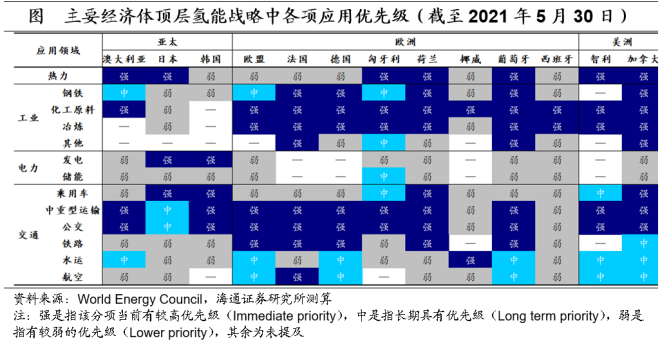 而在當前全球各主要經(jīng)濟體提出的頂層氫能戰(zhàn)略中,最受關注的應用領域是化工、冶煉、中重型運輸和公交。這說明,這些是在當前最具有緊迫性,也更具有可行性的技術應用領域,也是未來我國在氫能綜合應用中更應關注和突破的方向。