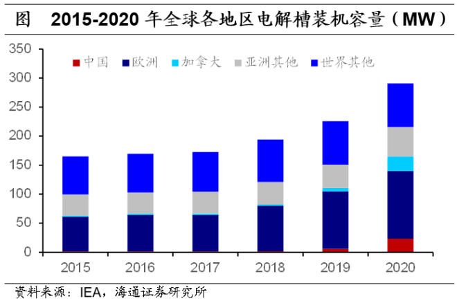 而且我國制備氫氣的資源很豐富,棄電資源能作為氫能供給的重要來源。中國是全球第一大可再生能源發(fā)電國,截至2020年底,中國可再生能源發(fā)電裝機總規(guī)模達9.3億千瓦,占全球總量的80%以上。我國每年在風電、光伏、水電等可再生能源上的棄電約1000億千瓦時,可用于電解水制氫約200萬噸,可再生能源有望成為中國綠氫供給的主要來源。