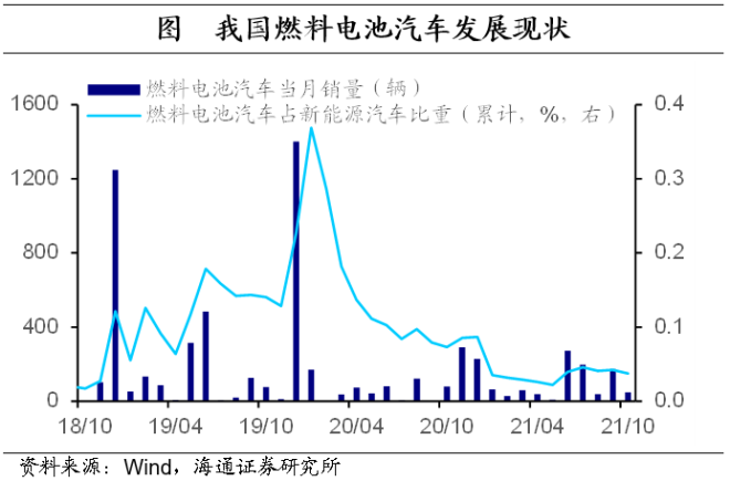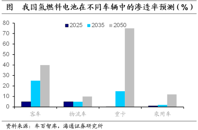 氫燃料電池在交通運輸行業(yè)中的應用是未來的重要增長點。目前我國燃料電池汽車占新能源汽車銷量的比重最高也不超過0.4%。其中,截至2020年8月,燃料電池車主要以物流車和客車為主,乘用車占比僅為0.1%,且主要用于租賃。根據(jù)車百智庫的預測,氫燃料電池汽車保有量將在2025、2035和2050年分別達到10萬、100萬和3000萬輛,年均增速約為25.6%,主要應用于重卡、客車等大型車輛中,在乘用車中的滲透率也將提高到12%。