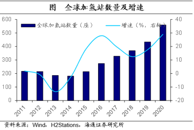 而氫燃料汽車的廣泛應用,還需要基礎設施,如加氫站的配套建設。截至2020年底,全球共建成加氫站約544座,其中我國128座,占比約為23.5%。根據(jù)《中國氫能與燃料電池白皮書(2019)》預測,我國加氫站數(shù)量在2035年將達到1500座,在2050年將達到10000座以上,為實現(xiàn)這一目標,加氫站數(shù)量的年均增速達15.6%。而根據(jù)香橙研究會統(tǒng)計的情況,當前我國加氫站建設的速度在全球領先,在建數(shù)量遠超其他國家和地區(qū),可以預見在近期,我國將繼續(xù)推進氫能基礎設施領域建設。