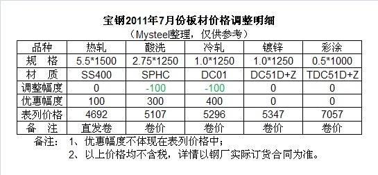 表一:2011年7月寶鋼主流板材品種價格調(diào)整明細(xì)(單位:元/噸)