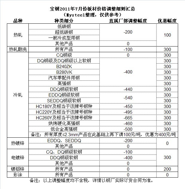 表二:寶鋼2011年7月份板材價格調(diào)整細(xì)則匯總(單位:元/噸)