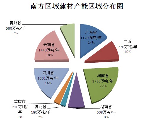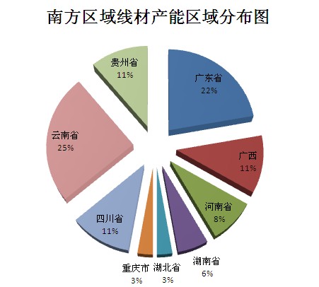 就產(chǎn)能分布來看,廣東省共8條線材生產(chǎn)線,總體產(chǎn)能達(dá)340萬噸;廣西有4條線材生產(chǎn)線,產(chǎn)能在220萬噸;河南省有3條線材生產(chǎn)產(chǎn)線,總體產(chǎn)能達(dá)250萬噸;湖南省線材產(chǎn)線有2條,產(chǎn)能在166萬噸;湖北省有1條線材生產(chǎn)線,產(chǎn)能在40萬噸左右;重慶市線材產(chǎn)線有1條,產(chǎn)能在50萬噸;四川省共4條線材生產(chǎn)線,產(chǎn)能在226萬噸;云南省有9條線材生產(chǎn)線,產(chǎn)能在490萬噸左右;貴州省有4條線材生產(chǎn)線,產(chǎn)能在170萬噸。如圖: