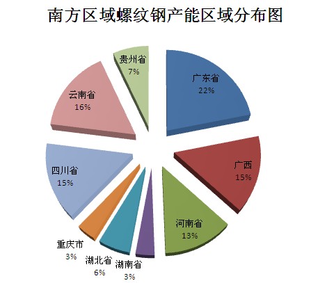 就產(chǎn)能分布來看,廣東省共19條螺紋鋼生產(chǎn)線,總體產(chǎn)能達(dá)830萬噸;廣西有13條螺紋鋼生產(chǎn)線,產(chǎn)能在550萬噸;河南省有11條螺紋鋼生產(chǎn)線,總體產(chǎn)能達(dá)1530萬噸;湖南省螺紋鋼生產(chǎn)線有3條,產(chǎn)能在442萬噸;湖北省有5條螺紋鋼生產(chǎn)線,產(chǎn)能在140萬噸左右;重慶市螺紋鋼生產(chǎn)線有3條,產(chǎn)能在160萬噸;四川省共13條螺紋鋼生產(chǎn)線,產(chǎn)能在1075萬噸;云南省有14條螺紋鋼生產(chǎn)線,產(chǎn)能在950萬噸左右;貴州省有6條螺紋鋼生產(chǎn)線,產(chǎn)能在410萬噸。如圖: