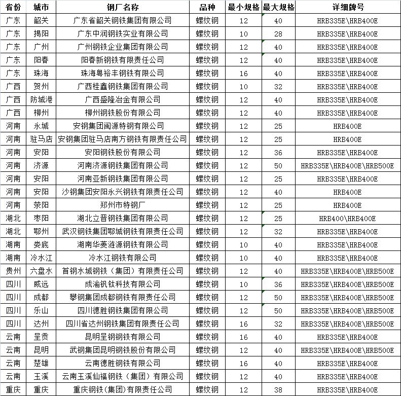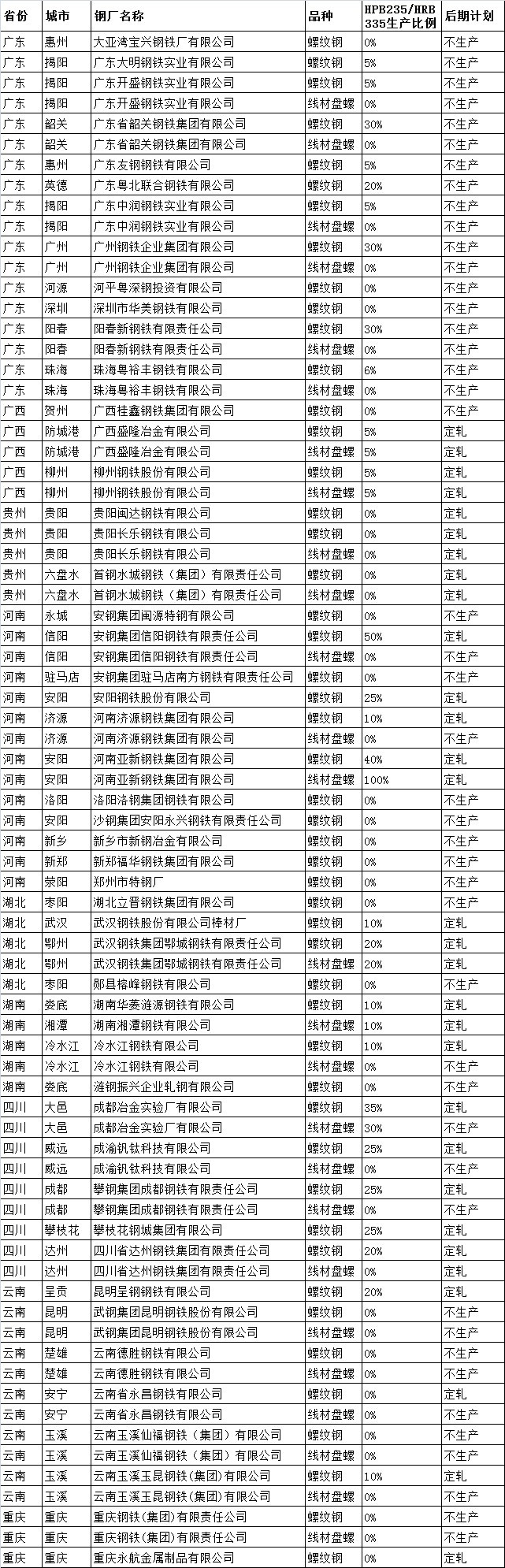 另附南方區(qū)域抗震鋼筋生產(chǎn)鋼廠明細(xì)、HPB235/HRB335生產(chǎn)比例以及生產(chǎn)規(guī)格生產(chǎn)能力情況。