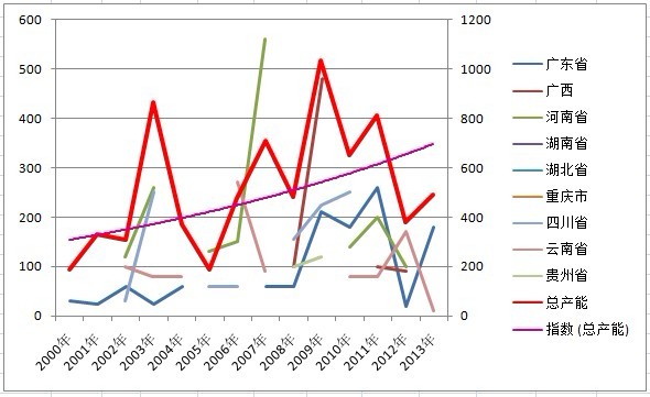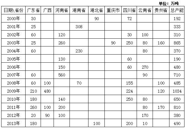2000年至2013年南方區(qū)域鋼廠新增產(chǎn)能情況