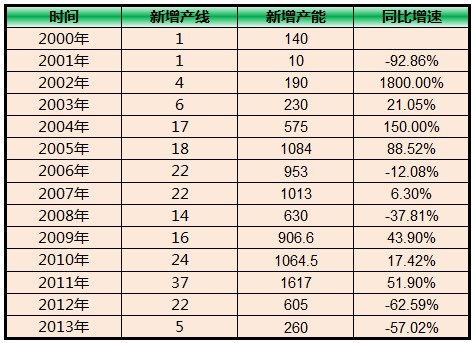 由上表可以看出,2000年以來,我國冷軋產(chǎn)能呈現(xiàn)擴(kuò)張態(tài)勢,其中2002年、2005年以及2009年擴(kuò)張速度較快,2009年之后,冷軋產(chǎn)能產(chǎn)線的擴(kuò)張速度有所放慢,而2013年冷軋產(chǎn)線的擴(kuò)展速度繼續(xù)下降,產(chǎn)能的擴(kuò)張呈增長態(tài)勢,高牌號、多功能等大型冷軋生產(chǎn)機(jī)組的建設(shè)速度在加快,也反映出冷軋生產(chǎn)企業(yè)因需而變。