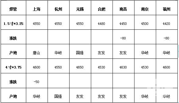 1、19日盤(pán)中唐山市豐南區(qū)增洲鋼管有限公司對(duì)直縫焊管出廠(chǎng)價(jià)格調(diào)整如下:直縫焊管價(jià)格下調(diào)20元/噸,現(xiàn)4寸國(guó)標(biāo)出廠(chǎng)報(bào)價(jià)4210元/噸;