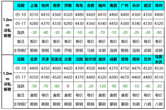 本周全國(guó)冷軋現(xiàn)貨價(jià)格呈下跌趨勢(shì),市場(chǎng)成交未有明顯增量。本周市場(chǎng)在市場(chǎng)普跌看跌情況之下,迎來(lái)了較為流暢的一段下跌行情。從市場(chǎng)調(diào)研情緒看,貿(mào)易商看空情緒濃厚,市場(chǎng)成交只有在低價(jià)資源中表現(xiàn)尚可,穩(wěn)價(jià)或者高價(jià)資源都被市場(chǎng)拋棄。終端這塊來(lái)看,本周公布了汽車(chē)產(chǎn)銷(xiāo)數(shù)據(jù),4月汽車(chē)行業(yè)數(shù)據(jù)表現(xiàn)較差。4月汽車(chē)制造業(yè)增加值同比下降1.1%,4月汽車(chē)制造業(yè)投資同比下滑1.4%,4月汽車(chē)產(chǎn)量同比下降15.8%,跌幅較上月擴(kuò)大13.2個(gè)百分點(diǎn),對(duì)于這個(gè)需求貿(mào)易商表現(xiàn),接下來(lái)冷軋價(jià)格還會(huì)繼續(xù)下跌,空間或有壓縮。價(jià)格方面:截至發(fā)稿,本周1.0mm冷軋均價(jià)為4385元,環(huán)比上周上跌45元/噸,F(xiàn)主要市場(chǎng)價(jià)格如下:天津市場(chǎng)1.0mm鞍鋼天鐵冷卷報(bào)價(jià)4180元/噸,環(huán)比上周下跌70元/噸;上海市場(chǎng)1.0mm鞍鋼冷卷報(bào)價(jià)4280元/噸,周環(huán)比持下跌30;廣州1.0mm鞍鋼冷卷報(bào)價(jià)4380元/噸,周環(huán)比下跌20元/噸。庫(kù)存方面:16日本網(wǎng)監(jiān)測(cè)23個(gè)城市庫(kù)存,本周冷軋板卷社會(huì)庫(kù)存116.69,周環(huán)比增加0.23,月環(huán)比增加1.03,年同比增加5.11。(單位:萬(wàn)噸)16日本網(wǎng)監(jiān)測(cè)26個(gè)城市庫(kù)存,本周冷軋板卷社會(huì)庫(kù)存118.51,周環(huán)比增加0.28,月環(huán)比增加1.20,年同比增加5.52。(單位:萬(wàn)噸)最新一期鋼廠調(diào)研方面:監(jiān)測(cè)的29家冷軋板卷生產(chǎn)企業(yè)中,本周開(kāi)工率87.23%,周環(huán)比持平;鋼廠產(chǎn)能利用率77.50%,周環(huán)比下降2.48%;鋼廠周實(shí)際產(chǎn)量為78.45萬(wàn)噸,周環(huán)比減少2.51萬(wàn)噸;鋼廠庫(kù)存31.26萬(wàn)噸,周環(huán)比增加1.04萬(wàn)噸。