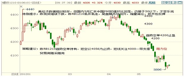 美經(jīng)濟數(shù)據(jù)利好,國內(nèi)5月匯豐中國PMI數(shù)據(jù)環(huán)比回落,連續(xù)5月居于50以下,昨螺紋現(xiàn)貨繼續(xù)下跌,昨RB1210低開低走,日內(nèi)走勢呈縮量減倉的技術性反彈走勢。