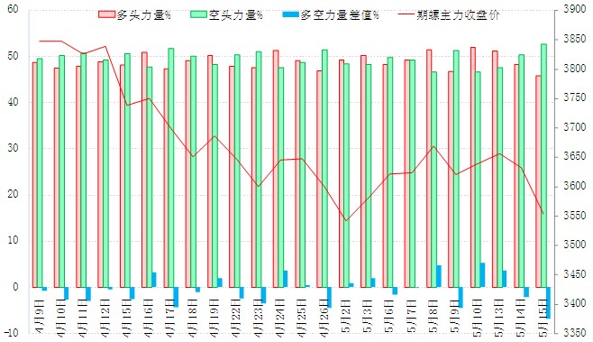 從期螺主力合約的價量分布圖,我們可以看出,在近5日多空力量爭奪中,多頭力量先占據(jù)了優(yōu)勢,但后來空頭卻大幅勝出。資訊分析師方德認為,空方勢力突然大幅殺回,意味著前期反彈行情的結(jié)束,在市場需求不濟,悲觀氛圍依然濃郁的環(huán)境下,螺紋或展開新一輪的下跌。