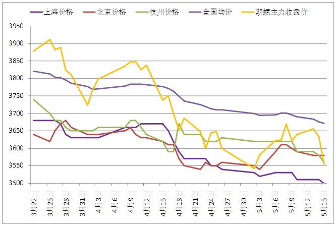 一、現(xiàn)貨市場價格分析 我們分別選取上海、北京、杭州三地的三級螺現(xiàn)貨價格與全國的均價及期螺主力收盤價作比較分析。從圖中我們可以看出,近期主要現(xiàn)貨市場價格不斷走弱;期螺主力合約大…