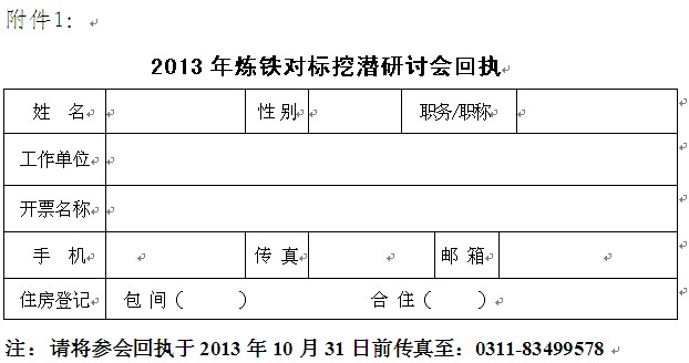 2.擬參會(huì)人員請(qǐng)于10月31日前將參會(huì)回執(zhí),傳真至0311-83499578或發(fā)至郵箱:yejinzg@126.com (具體見(jiàn)附件1回執(zhí)單)