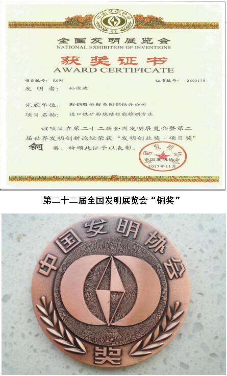 發(fā)明專利《進口鐵礦粉燒結(jié)性能檢測方法》獲第二十二屆國際發(fā)明展覽會“銅獎”。