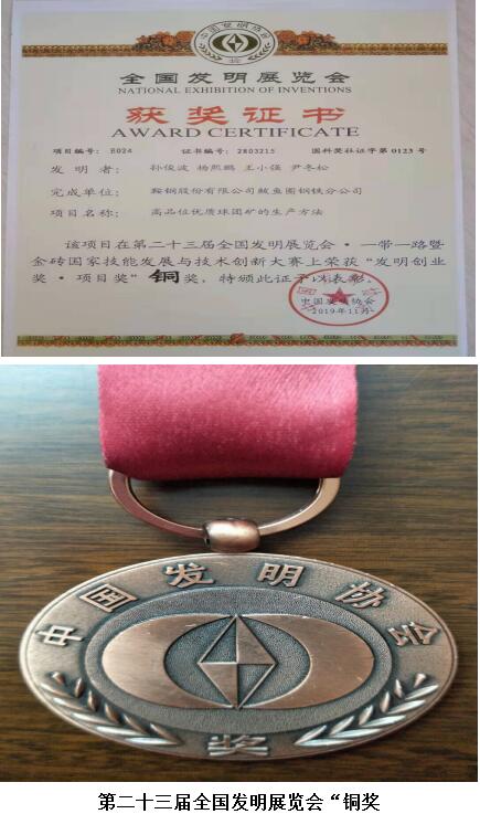 發(fā)明專利《高品位優(yōu)質(zhì)球團礦的生產(chǎn)方法》獲第二十三屆國際發(fā)明展覽會“銅獎”。