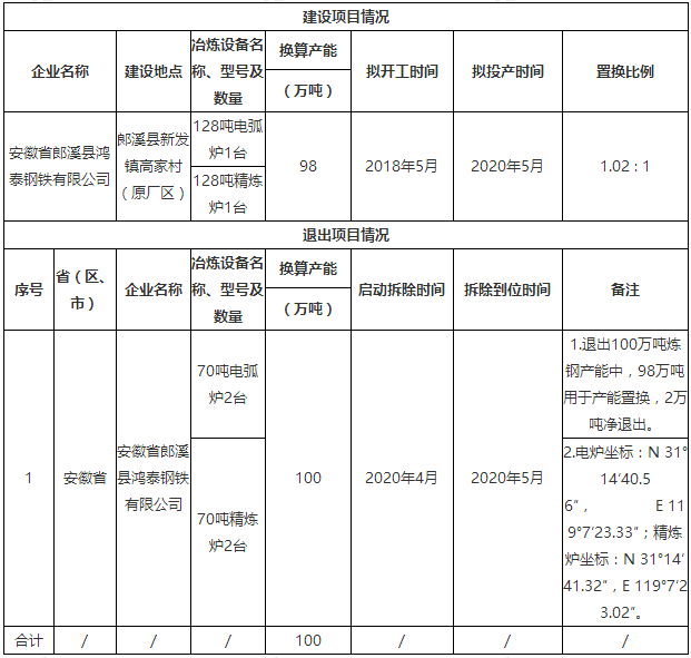 關(guān)于安徽省郎溪縣鴻泰鋼鐵有限公司128噸電弧爐建設(shè)項(xiàng)目產(chǎn)能置換方案的公告