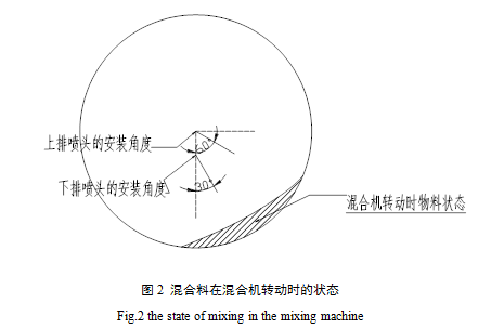 增加一次混合機(jī)上排霧化噴嘴的數(shù)量,上下兩排水管在每2米一組里面各平均分布4個(gè)霧化噴嘴。每排霧化噴嘴間距為500毫米,上下兩排相鄰霧化噴嘴的間距為250毫米。上排霧化噴嘴的安裝角度和加水管垂直面成30℃角,下排霧化噴嘴的安裝角度和加水管的垂直面成60℃角,這樣既能保證再出現(xiàn)霧化噴嘴堵塞的情況下依然能夠把水加足,不會(huì)出現(xiàn)加水的不足現(xiàn)象,也能使每段加水平均分布。