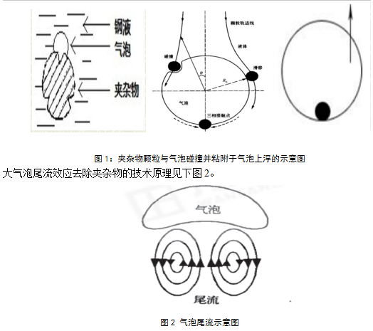 鋼液脫氧,除了將鋼液中間的自由氧和浮氏體與脫氧元素發(fā)生反應(yīng),將氧或者氧化鐵(浮氏體)轉(zhuǎn)化為穩(wěn)定的氧化物,即氧的轉(zhuǎn)化和固定,這樣可以降低氧在鋼水澆鑄過程中和軋制過程中的危害,但是這些氧化物留在鋼液中間,軋制成材以后,會影響鋼材的使用性能和加工性能,所以還需要將這些脫氧產(chǎn)物去除,而去除這些夾雜物,目前有效的工藝方法是氣泡粘附去除和大氣泡尾流去除兩種工藝方法。而這種氣泡去除夾雜物的工藝幾乎是目前鋼鐵業(yè)99%以上的企業(yè)采用的工藝方法。其中小氣泡粘附去除夾雜物的示意圖見下圖1[4]: