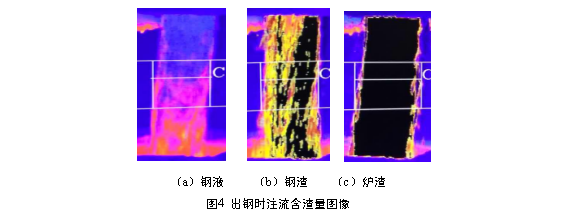 轉(zhuǎn)爐紅外下渣檢測(cè)系統(tǒng)根據(jù)鋼渣與鋼水在特定光波波段的差異,使用攝像儀拍攝出鋼圖像,并將圖像送到工控機(jī),在圖像采集卡處理后,由軟件對(duì)采集的圖像信號(hào)進(jìn)行識(shí)別處理,自動(dòng)分辨出鋼流中的鋼水和鋼渣,圖4所示。