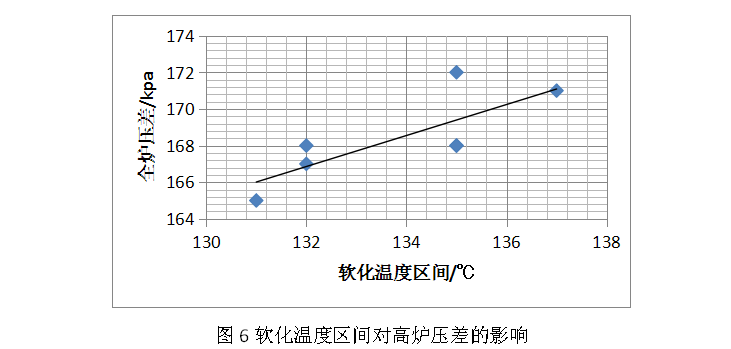 因此我們應從提高球團礦軟化溫度,縮小與高堿度燒結(jié)礦軟化溫度差距,降低整體料柱軟熔溫度區(qū)間的角度出發(fā)來進行爐料結(jié)構優(yōu)化。從國內(nèi)某3200m3高爐燒結(jié)礦軟化熔滴區(qū)間對料柱壓差的影響來看,軟化熔滴區(qū)間窄料柱整體壓差低,高爐透氣性好,有利于高爐指標的提升。隨軟化溫度區(qū)間的增大,爐料壓差增大,呈現(xiàn)正相關對應關系,每增加1℃,壓差增加0.8kpa(如圖6所示)。