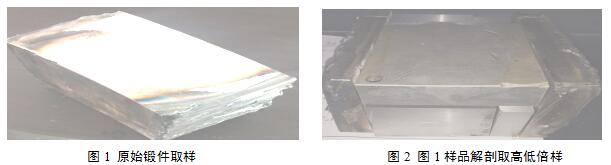 根據(jù)探傷檢測(cè)的情況,從原始鋼圈上截取超聲檢測(cè)不合位置處的塊樣,對(duì)該塊樣進(jìn)行解剖,1)切取超聲檢測(cè)不合位置處的縱方向平面,橫向3cm厚,作為樣1做低倍檢驗(yàn);2)切取垂直于縱方向的樣品作為樣2做低倍分析;3)切取樣1圓周方向厚度1/2處做高倍分析。