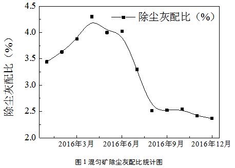 燒結(jié)礦是高爐用最主要含鐵料,也是入爐堿金屬最主要來(lái)源,通過(guò)適當(dāng)調(diào)整入燒除塵灰配比,可以及時(shí)有效控制高爐入爐堿負(fù)荷。