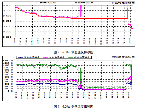 七高爐爐缸新增電偶標(biāo)高6.00m,9、10點(diǎn)方向(西南)電偶溫度及侵蝕過(guò)程推移圖形見(jiàn)下圖。
