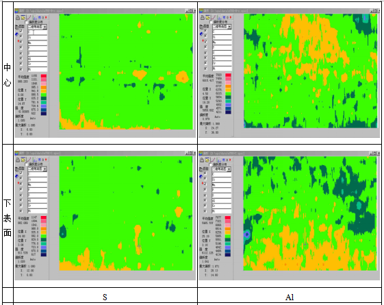 鑄坯低倍顯示內(nèi)部質(zhì)量良好,未見裂紋、縮孔等缺陷。偏析類別為C類0.5,鑄坯偏析控制較好,為后續(xù)帶狀控制提供的良好的基礎(chǔ)。此外采用原位分析儀對(duì)鑄坯偏析進(jìn)行了半定量分析,分析檢測(cè)了C、Mn、S、P、Si、Al的偏析情況,結(jié)果表明所有元素偏析度在1.0左右,最大偏析度在1.1左右,結(jié)果較好。其中易偏析元素C、Mn、S和Al的偏析情況如表4所示。