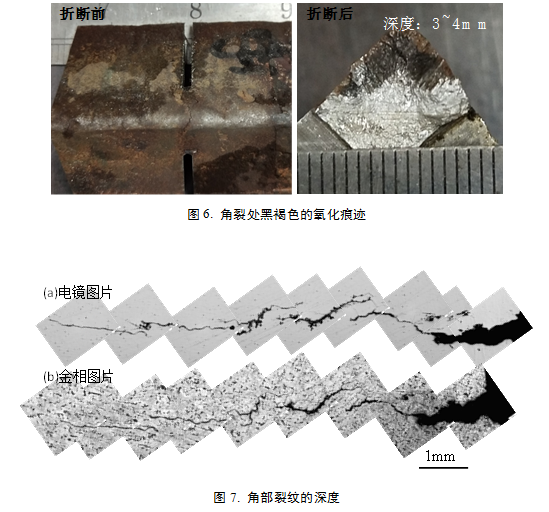將鑄坯從角裂處折斷,觀察到了黑褐色的氧化痕跡,滲透至基體內(nèi)3~4mm,如圖6所示。沿鑄坯角部45°線切割,并磨拋成金相試樣,置于電子顯微鏡和金相顯微鏡下觀察,發(fā)現(xiàn)裂紋滲透至基體內(nèi)部10mm,如圖7所示。據(jù)文獻(xiàn)[2]報(bào)道,裂紋深度小于2mm的在加熱爐可被氧化鐵皮去除,大于2mm的則可能遺傳至板卷表面形成表面缺陷。