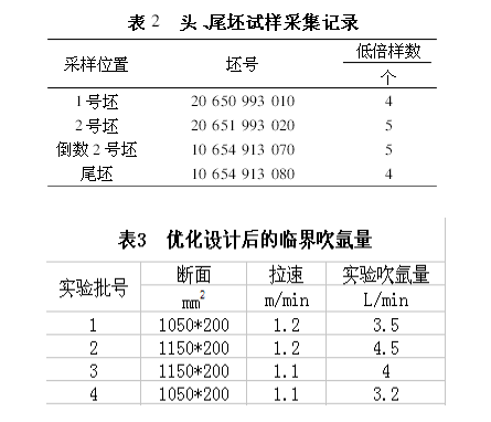 結(jié)合實(shí)際生產(chǎn)狀況,建立了現(xiàn)場(chǎng)試驗(yàn)方案。試驗(yàn)分為兩部分:首先是對(duì)結(jié)晶器內(nèi)有無(wú)吹氣時(shí),鑄坯針狀氣孔產(chǎn)生情況進(jìn)行比較分析。由于連鑄機(jī)開(kāi)澆后的一段時(shí)間結(jié)晶器內(nèi)沒(méi)有吹氣