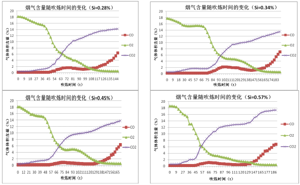 從上面的典型控制曲線可以看出:不同硅數(shù)的鐵水在吹煉前期時(shí),煙氣中的CO含量達(dá)到6%,此時(shí)煙氣中O2含量都低于9%,避開(kāi)了容易造成靜電除塵卸爆的條件。