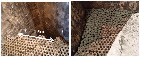 本鋼七號高爐配備三座霍戈文內(nèi)燃式熱風爐,霍戈文式熱風爐具有高效矩形燃燒器、穩(wěn)定的眼鏡型燃燒室、保溫型蘑菇形拱頂結(jié)構、高效的蓄熱室和耐高溫送風管路等優(yōu)點,并且安裝了高效分離型雙預熱熱管換熱器。因爐役后期2#、3#熱風爐送風溫度僅為1120℃,在拱頂和廢氣溫度相同的情況下,送風效率遠低于正常水平,所以借高爐大修機會進行檢修,主要更換2座熱風爐蓄熱室上部92層硅磚和對蓄熱室大墻與爐墻夾角處出現(xiàn)的三角貫穿孔進行填球處理。