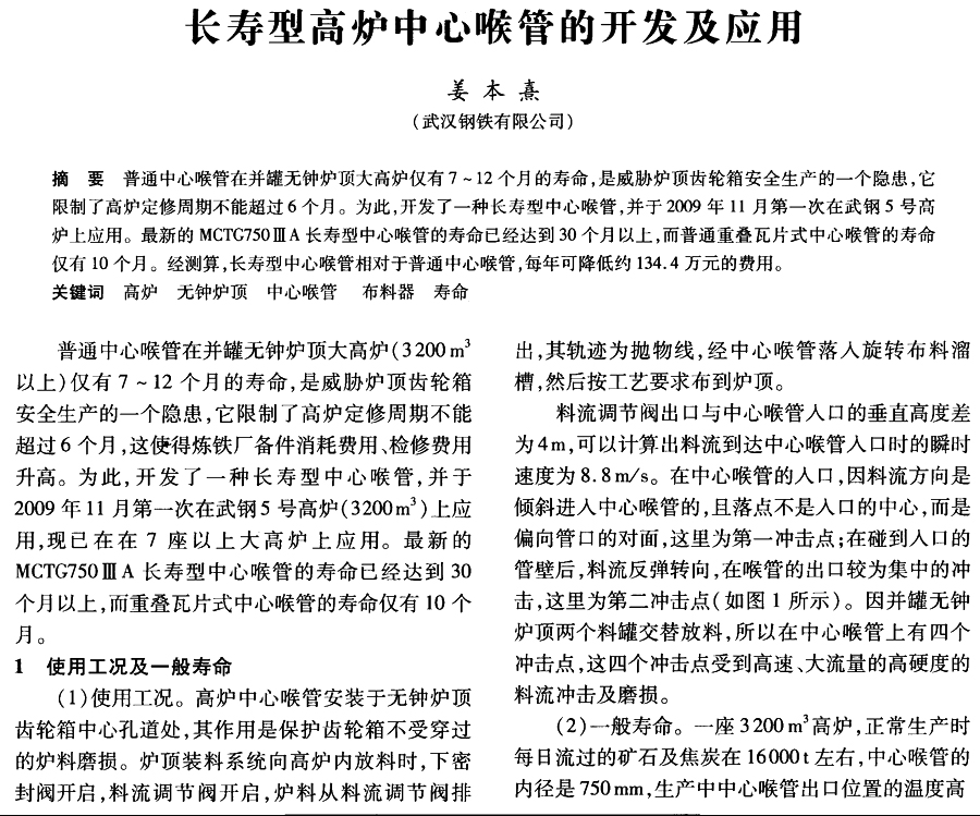 長(zhǎng)壽型高爐中心喉管的開發(fā)及應(yīng)用