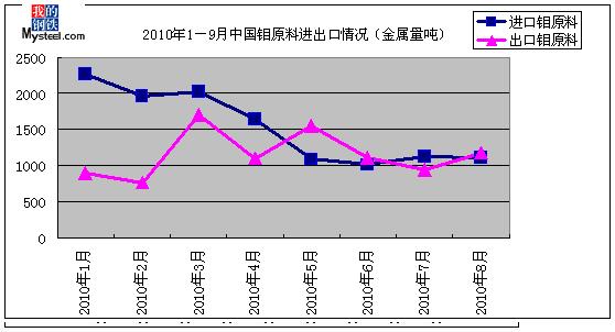 據(jù)海關(guān)數(shù)據(jù)顯示,2010年9月全國共進(jìn)口鉬原料(金屬量)1148.58噸(含鉬精礦71噸、氧化鉬1959噸),環(huán)比增加3.2%,出口鉬原料(金屬量)1210.56噸(含鉬精礦58噸、氧化鉬2078噸),環(huán)比增3.1%。進(jìn)出口數(shù)量總數(shù)趨于平衡。