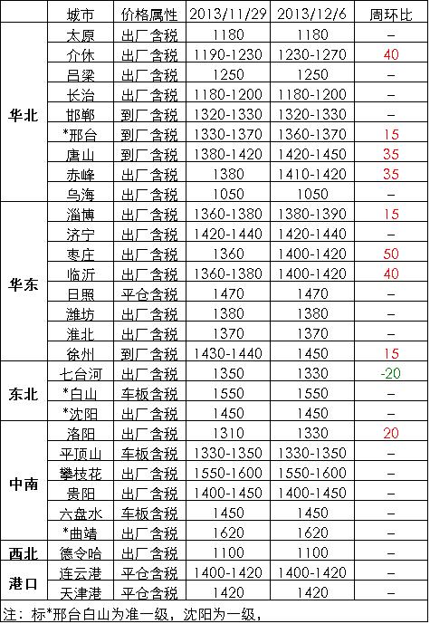 徐州、安徽等地本周普遍上漲30元左右,連云港及蘇南地區(qū)鋼廠庫(kù)存仍偏低,隨冬季來(lái)臨,雨霧天氣逐漸成為運(yùn)輸方面制約因素,相當(dāng)一部分運(yùn)量發(fā)運(yùn)遲滯,貨源持續(xù)偏緊,市場(chǎng)成交狀況持續(xù)向好。年末市場(chǎng)走勢(shì)預(yù)期較多不確定性,下半年新增產(chǎn)能可觀,并且環(huán)保方面問(wèn)題也越來(lái)越普遍,長(zhǎng)期走勢(shì)有待觀察。本周部分焦粉焦粒格也有小幅上調(diào)。