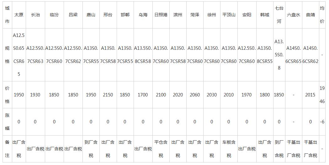 6日全國主要城市冶金焦價格匯總