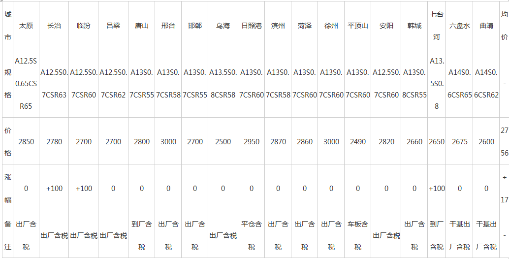 城市太原長治臨汾呂梁唐山邢臺邯鄲烏海日照港濱州菏澤徐州平頂山安陽韓城七臺河六盤水曲靖均價規(guī)格A12 5S0 65CSR65A12 5S0 7CSR63A12 5S0 7CSR60A12 5S0 7CSR62A13S0 7CSR55A13S0 …