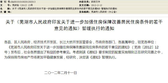 關(guān)于《蕪湖市人民政府印發(fā)關(guān)于進(jìn)一步加強(qiáng)住房保障改善居民住房條件的若干意見(jiàn)的通知》暫緩執(zhí)行的通知