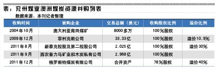 本刊記者查閱公司歷史公告顯示,公司自2004年至今,在澳大利亞共有5次并購行為,最早發(fā)生在2004年,在其后5年之內(nèi)并無任何并購,直至2009年公司再次發(fā)起澳洲擴張運動,2009年-2011年之間集中在澳大利亞等地大量收購煤礦資源,海外并購業(yè)務更是以雙倍速度快速增長,而這個時間段正是煤炭行業(yè)景氣高位,收購成本也比較高,收購雖比較合理,但仍有不同程度的溢價(見表)。