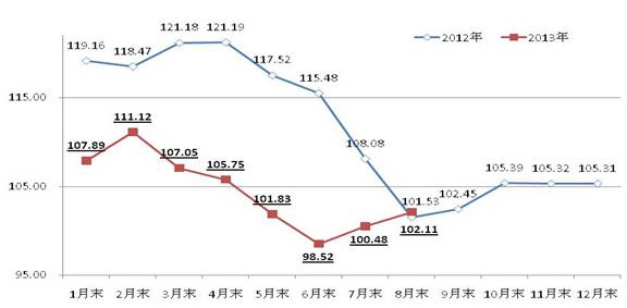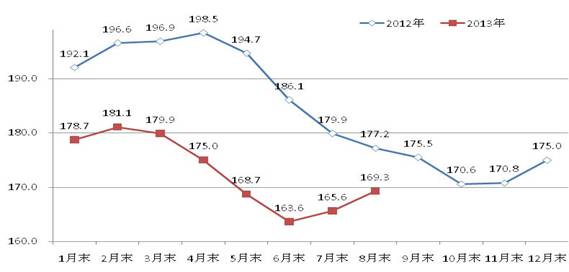 項(xiàng)目 | 8月末 | 7月末 | 環(huán)比 漲跌 | 幅度% | 上年 同期 | 同比 漲幅% |