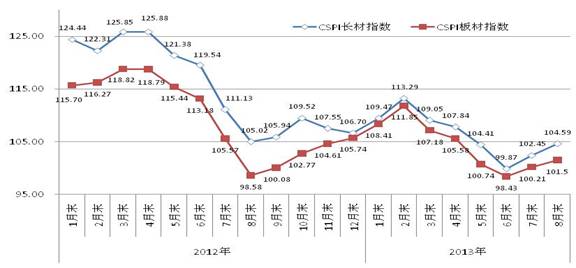 8月末,CSPI長(zhǎng)材指數(shù)為104.59點(diǎn),環(huán)比上升2.14點(diǎn),升幅為2.09%,較上月收窄0.49個(gè)百分點(diǎn);板材指數(shù)為101.50點(diǎn),環(huán)比上升1.29點(diǎn),升幅為1.29%,較上月收窄0.52個(gè)百分點(diǎn);長(zhǎng)材價(jià)格升幅比板材高0.80個(gè)百分點(diǎn);與去年同期相比,長(zhǎng)材指數(shù)下降0.43點(diǎn),降幅為0.41%;板材指數(shù)上升2.92點(diǎn),升幅為2.96%。(見(jiàn)下圖、下表)
