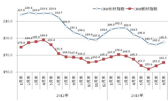 CRU國(guó)際長(zhǎng)材和板材價(jià)格指數(shù)走勢(shì)圖