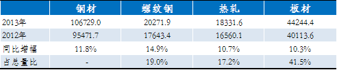 熱軋卷板是鋼材的主要品種,被廣泛應用于建筑、機械制造等行業(yè)。一般意義上的熱軋卷板指熱軋薄板、中厚寬鋼帶和熱軋薄寬鋼帶,2013年三者統(tǒng)計的產(chǎn)量達到1.833億噸,相比2012年增10.7%,占鋼材總量的17.2%。算上中厚板、冷軋及涂鍍,整個板材產(chǎn)量為4.4億噸,同比增10.3%,占鋼材總量的41.45%,對應的螺紋鋼產(chǎn)量為2.03億噸,同比增14.9%,占鋼材總量19%。由此可見,熱軋及相關產(chǎn)品占鋼材總量的比重非常高。