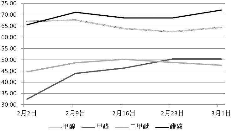 2月份甲醇下游需求逐步增加。2月甲醇總需求量為223.3萬噸,環(huán)比增加13.5%。主要體現(xiàn)為甲醛、二甲醚、醋酸及DMF需求增加。其中,甲醛需求甲醇量60.1萬噸,環(huán)比增長48%;二甲醚需求甲醇量63.7萬噸,環(huán)比增長4.2%;醋酸需求甲醇量23.3萬噸,環(huán)比增長15.4%;DMF需求甲醇量4.04萬噸,環(huán)比增長55%。下游需求逐步增加成為甲醇價格上漲的一個主要動力。