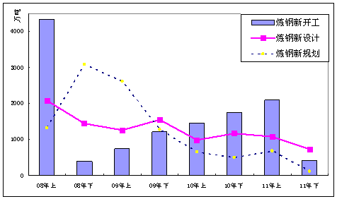 在新增粗鋼產(chǎn)能方面,2011年下半年,新開工、新設(shè)計(jì)、新規(guī)劃煉鋼產(chǎn)能分別為420萬噸、736萬噸和127萬噸,較上半年分別大幅下降80%、32.3%和81.3%,處于近年來最低水平,與此同時(shí),采、選礦投資持續(xù)增加。下圖為2008年以來各時(shí)間段新開工、新設(shè)計(jì)、新規(guī)劃煉鋼產(chǎn)能情況。企業(yè)已從單純追求擴(kuò)大產(chǎn)能向技術(shù)改造、資源開發(fā)、循環(huán)經(jīng)濟(jì)方向發(fā)展,抑制產(chǎn)能過剩、加快產(chǎn)業(yè)結(jié)構(gòu)調(diào)整已經(jīng)成為共識(shí)。